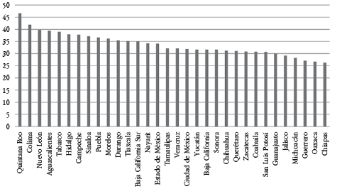Finalmente, el análisis descriptivo y con regresión lineal múltiple considera las variables nominales “entidad federativa” y “sector”: el sector más afectado durante la pandemia fue el de servicios no financieros, con una media de muertes de 52.84% en Quintana Roo (Figura 1). Esto tiene sentido considerando que dicho estado es conocido por su industria hotelera, la cual se vio gravemente afectada por las restricciones y el impacto negativo en el turismo durante la pandemia.