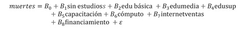 En este modelo, la proporción de muertes en las empresas durante la pandemia está influenciada por tres variables: educación media (edumedia), educación superior o posterior (edusup) y capacitación (capacitacion), es decir: