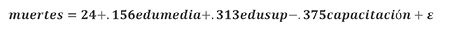 Esto sugiere que la capacitación tiene un efecto negativo en la proporción de muertes, mientras que los niveles de educación media y superior tienen efectos positivos.