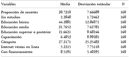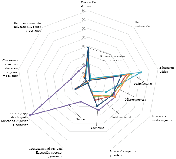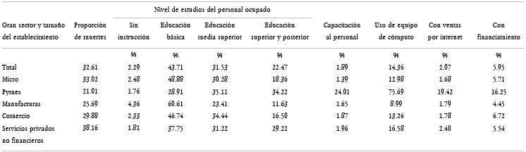 La media de muertes de las empresas nacionales es del 30.7% (Cuadro 1). Observamos que el porcentaje de muertes varía según el nivel educativo del personal ocupado en las empresas durante la pandemia. Por ejemplo, 2.28% de las empresas que cerraron durante la pandemia tenían personal sin estudios, mientras que 44.28% tenían educación básica, 31.7% educación media, y 21.66% educación superior o posterior. Además, se observa que sólo 6.4% de las empresas que cerraron durante la pandemia proporcionaron capacitación a su personal, 27.2% manejaban el uso de equipos de cómputo, 5.2% realizaron ventas por internet, y 8.5% tuvieron acceso a financiamiento.