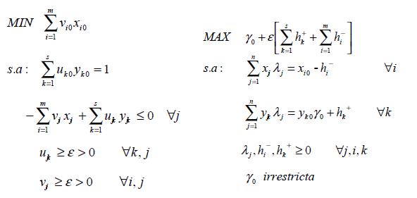 El modelo análisis envolvente de datos se formaliza asumiendo que hay n DMU por ser evaluadas, cada una de las cuales requiere de inputs diferentes para producir outputs. La DMU utiliza un valor de X. = x. inputs (i = 1, 2, m) y produce un valor de Y = ykj productos (k = 1, 2, s). En este caso, se considera un modelo orientado a los outputs, conocido como el modelo BCC-output (Charnes, Cooper y Rhodes, 1978), modelo aceptado para medir la eficiencia en el sector público (Cano y Ramírez, 2007; Quesada, Blanco y Maza, 2010). El esquema planteado se interpreta como un problema de programación lineal, como se muestra a continuación: