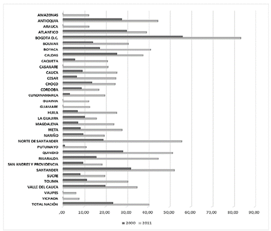 Respecto de la cobertura, las cifras del Instituto de Estadísticas de la Unesco (2015) arrojan que, en lo corrido del siglo XXI, Colombia ha mejorado notoriamente el acceso a la educación superior en sus distintos niveles de formación, especialmente en la formación técnica y tecnológica1 (la tasa de cobertura en educación superior pasó de 23.92 % en 2000 a 45.02 % en 2012, lo cual significa un incremento de 21.1 puntos porcentuales en doce años). Sin embargo, en el contexto internacional, la tasa de cobertura aún continúa siendo muy baja, incluso por debajo del promedio para América Latina. En el ámbito regional, la cobertura es muy heterogénea. Según las cifras para 2011 del MEN, mientras que la tasa de cobertura para Bogotá fue de 83.3 %, y la de Norte de Santander de 55.66 %, trece departamentos -entre ellos Amazonas, Guainía, Putumayo y Vaupés- reportaron tasas inferiores a 20 %, lo cual indica una brecha interdepartamental de más de 60 puntos porcentuales (figura 1). Estos problemas se agudizan cuando la población pertenece a grupos étnicos (comunidades negras, raizales, indígenas y rom), se encuentra en condición de discapacidad, son víctimas o victimarios desmovilizados del conflicto armado, o son población habitante de frontera (CESU, 2014; MEN, 2013).
