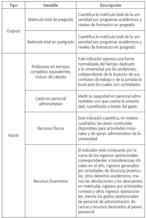 Para lograr un nivel dado de cobertura educativa (con independencia del nivel de calidad), cada institución universitaria oficial debe gestionar y comprometer, de manera racional, una combinación adecuada de recursos humanos, físicos y financieros. Partiendo de esta premisa, se han considerado como inputs las siguientes variables: Profesores en tiempos completos equivalentes, que recoge el total de docentes vinculados a la institución, tanto catedráticos -en sus diversas modalidades- como de planta, pero valorados respecto de los profesores de planta equivalentes; Gasto en personal administrativo, que involucra los gastos en que incurre la institución en el personal que realiza las actividades administrativas; Recursos físicos, que representa las áreas, en metros cuadrados, con que cuenta la institución para la realización de sus actividades misionales; y Recursos financieros, representada en los recursos con que cuenta la institución para invertir en sus actividades misionales. Estos se obtienen de restar de los recursos obtenidos por matrícula, venta de servicios y transferencias de la nación los gastos asociados al pago de salarios del personal docente y administrativo, además del pasivo pensional. Un resumen de las variables se observa en la tabla 1.
