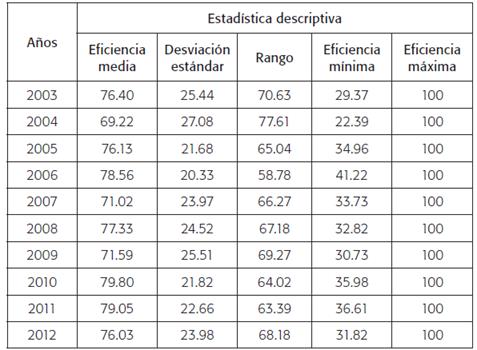 El análisis para 2003-2012 arrojó que la eficiencia promedio en la cobertura de las universidades públicas colombianas se encontró por encima de 70 %, salvo en 2004 cuando se situó en 69.2 %. Cabe destacar las altas fluctuaciones de la eficiencia durante todos los años -medida por el rango de la eficiencia entre las instituciones- que alcanzaron en algunos casos hasta 77.61 puntos porcentuales (tabla 2). Esto indica las grandes diferencias en la gestión de cada universidad pública de Colombia.