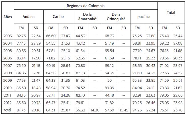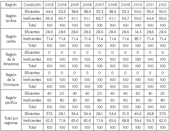 Los resultados arrojaron que, si bien las eficiencias promedio de las universidades públicas colombianas se situaron por encima de 70 % durante el periodo analizado, se observaron profundas diferencias entre las regiones. En particular, la región andina -que incluye las universidades situadas en Bogotá- tiene los mayores niveles de eficiencia y el mayor número de instituciones eficientes. Por su parte, las universidades de la región caribe y de la Amazonia obtienen las eficiencias promedio más bajas. Un hecho por destacar es que las regiones con mayor desempeño eficiente son aquellas con mayores niveles de cobertura en la educación superior en Colombia.