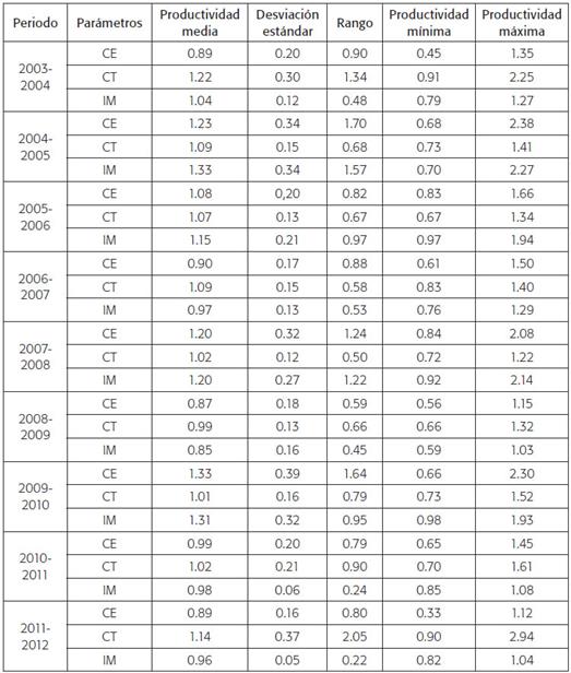 Esta sección se dedica al análisis de los cambios en la productividad, medida por el índice de productividad de Malmquist, y la descomposición en sus dos factores: Cambios en la eficiencia y Cambios en la tecnología. Los resultados arrojan que, a lo largo del periodo 2003-2012, la productividad ha crecido alrededor de 9 %, debido a mejoras tecnológicas, principalmente 7 %, apoyadas por un incremento de la eficiencia productiva 4 %. Cabe destacar el periodo 2008-2009, donde la productividad tuvo un fuerte descenso: 11 puntos porcentuales. Aunque disminuyó levemente la tecnología, el principal motivo de este resultado fue la caída, en 13 puntos porcentuales, de la eficiencia. Vale la pena señalar la existencia de una alta variabilidad en los resultados de las universidades públicas en todos los periodos de análisis, lo cual muestra las diferencias de sus resultados frente a los esfuerzos realizados por cada institución para incrementar su productividad (tabla 5).
