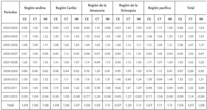 El cambio productivo por regiones colombianas arroja resultados interesantes. Por una parte, todas las regiones experimentaron incrementos en su productividad. Sin embargo, las universidades con los crecimientos más elevados se encuentran en la región pacífica, de la Amazonia y de la Orinoquia, todas con tasas promedio de 11 puntos porcentuales. Cabe destacar que la región caribe obtuvo la tasa de crecimiento promedio más baja de todas las regiones. Por otra parte, y salvo la región de la Amazonia, los incrementos en la productividad fueron impulsados por mejoras tecnológicas (tabla 6).