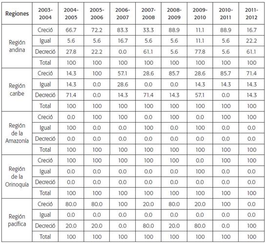 En el análisis de los cambios en la productividad de las universidades públicas por regiones, se puede observar una clara tendencia hacia el crecimiento de todas durante el periodo de estudio (tabla 7). La región de la Orinoquia obtuvo el mejor desempeño, pues 87.5 %, aproximadamente, de sus instituciones crecieron durante el periodo, seguido de la Amazonia (62.5 %) y la región pacífica (60 %).