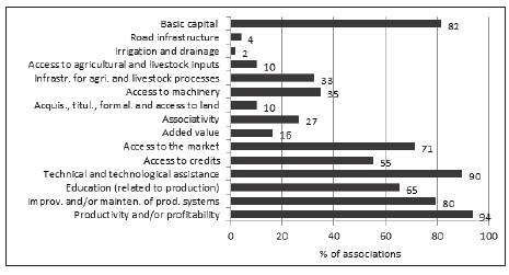 The project topics developed by the farming associations are presented in Table 1. The first category, machinery, was primarily for cattle production, however, a few machines were for agricultural purposes. The workshops revealed that the main concern of the farming associations was limits in productivity and/or profitability of their projects, lack of access to technical assistance and deficiency in basic capital available to the farmers and their families. Also, the need for improvement or maintenance of production systems, lack of access to the market and to production related education raised concern in participants from different associations. In addition, lack of access to credits was identified as a limiting factor, and several associations indicated that their production was restricted by deficient access to machinery, as well as the need for improved access to agricultural infrastructure. To a lesser degree, concerns were expressed regarding lack of associativity, lack of added value to the product, limits in access to land and agricultural inputs, deficient road infrastructure and the need for irrigation systems (Figure 1).