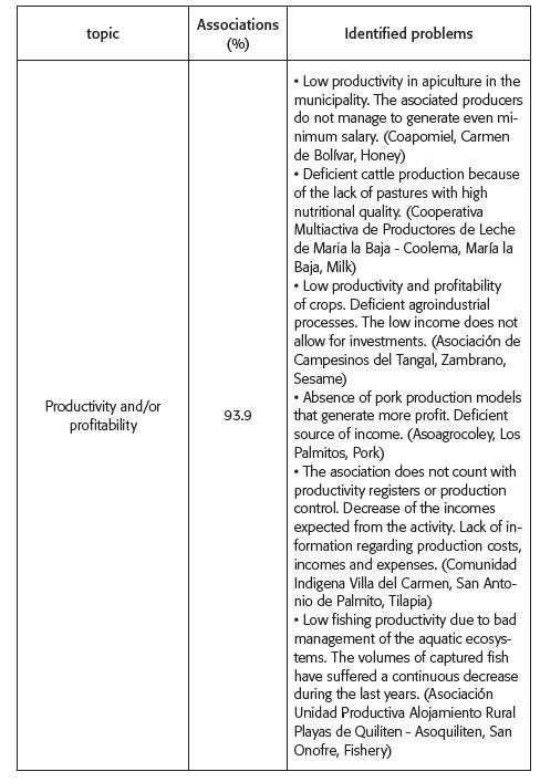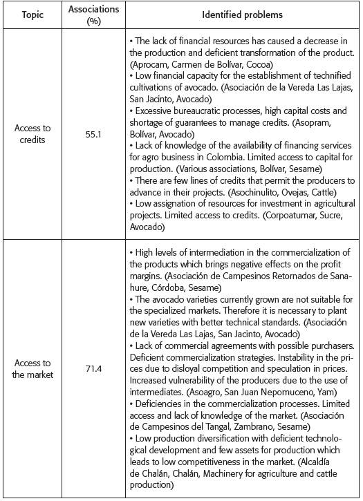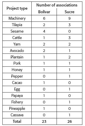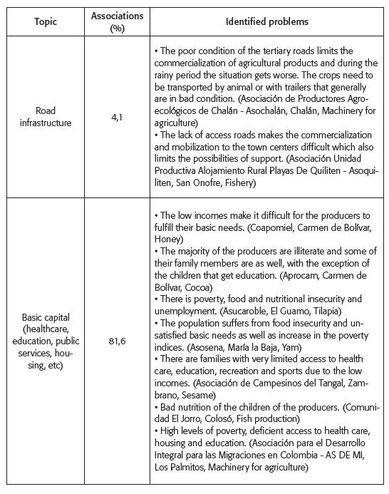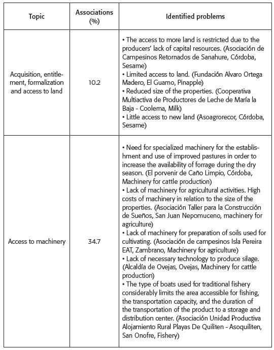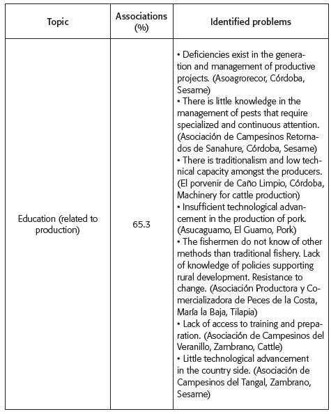 Categorizing and exploring the underlying causes of these obstacles in greater depth it could be seen that most of the associations indicated that their production systems are not as efficient as they could be. For example, some of the concerns mentioned were that there is a lack of pork production models that generate sufficient income and that cattle production is deficient due to lack of high quality pastures (Table 2). Associations, such as 'Coapomiel' mentioned that profits do not even reach the level of minimum wage and others such as 'Asociación de Campesinos del Tangal' indicated that the low incomes are not sufficient to allow for reinvestments in the production system. As indicated by several associations, there is need for improvement and maintenance of the production systems, such as improved management of soils, as well as management of pests and diseases in the permanent crops. Several of the associations indicated that there is little technological advancement in the countryside and certain resistance to change (Table 3). Lack of knowledge on how to implement technological advancement in the field was a common concern in the workshops, as well as lack of access to training and education. One of the main concerns expressed in the workshops was the lack of continuous programs of technical and technological assistance offered to the farmers. For many farming associations, limited access to credits hinders investment possibilities and therefore development of the production business (Table 4). Some concerns expressed were lack of knowledge on availability of financial services for agrobusinesses, excessive bureaucratic processes, high capital costs, and shortage of guarantees to manage credits. In addition, there is a need to improve the farmers' access to the market. For example, it was expressed that there is a high level of intermediation in the commercialization of products, resulting in low profitability and that there is lack of commercial agreements with possible purchasers (Table 4). Lack of knowledge of market needs and lack of ability to meet with demand were other issues identified. Various associations expressed deficiencies in adding value to products such as eviscerating and filleting of fish, processing of meat and milk as well as cocoa and traditional products such as yam and cassava. Improved associativity was identified by several farming associations as a way of strengthening the business of farmers and commercialization of the products. Five associations indicated that restricted access to land was limiting their production (Table 5). Some simply indicated that properties were too small or that there was limited access to new land while others identified lack of capital resources as the limiting factor. Lack of access of machinery was an important concern for many associations, and 15 of the 49 formulated projects were directly soliciting resources to form machine parks. These were principally destined to improve soils for cultivation of pastures used in cattle production, but also for agricultural purposes. Another example was a concern over a lack of boats that would allow for higher transportation capacity and covering greater areas for fishing activities. Lack of infrastructure, such as storage and distribution centers to improve harvest and post-harvest management conditions was identified as a limiting factor by close to a third of the associations, amongst them for projects in cocoa, papaya, egg, fishery, and honey. Some associations expressed concern about the lack of access to inputs for agricultural and livestock purposes. In two cases, this was related to the limited production of raw material to be used in production plants, restricting productivity of the agro-industrial component of the associations. In two different associations, concern was related to the low availability and high costs of supplemental feed for cattle. One association indicated that they had a need to install an irrigation system to optimize the production of papaya. The lack, or poor condition, of road infrastructure was identified by two associations as a limiting factor for commercialization of the products (Table 6). It was indicated that the state of the roads became worse during the rainy season and that the harvest needed to be transported by animal or trailers that generally are in very bad condition. Many farmers in Montes de María live in poverty, and 82 per cent of the associations indicated that they lack basic capital for their families. Low income, poverty, illiteracy, food insecurity, unemployment, limited access to education, healthcare and decent housing were indicated as deficiencies in the region.