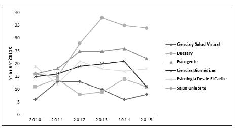 En total se analizaron seis revistas en las cuales se registraron 75 números, 631 manuscritos, 2117 autores y 221 instituciones. El número de artículos cuantificado por revista fue: Salud Uninorte con 167, seguida de Psicogente con 133, Psicología desde el Caribe con 106, Ciencias Biomédicas con 103, Duazary 66 y Ciencia y Salud Virtual con 56, para una media de 98,1 artículos por revista, los cuales fueron agrupados por año, y mostró una tendencia variable a medida que se avanza entre volúmenes (figura 1).