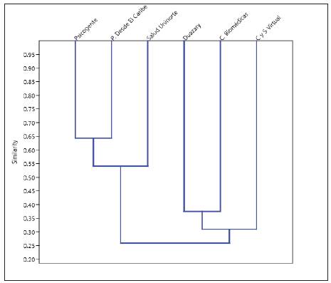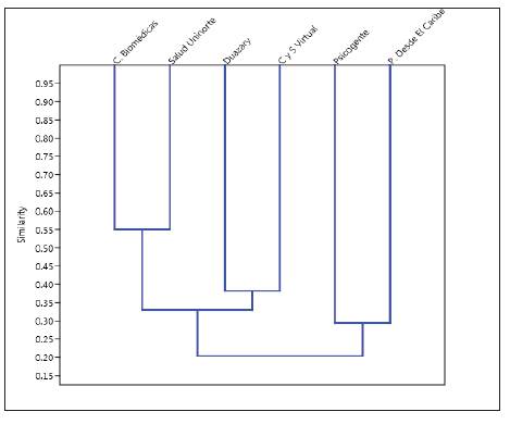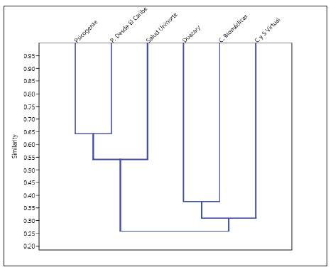 Este resultado puede verse fundamentando en la cantidad de disciplinas cubiertas en ambas revistas (tabla 1), al igual que el número de artículos publicados en estas. De la misma forma, se encuentra una leve relación entre las revistas Duazary y Ciencia y Salud Virtual, con un valor cercano al 40 %. Por el lado de las revistas Psicología desde el Caribe y Psicogente, era de esperarse que estuvieran agrupada por separado, debido a su condición de revistas especializadas, aunque la similitud entre ambas fue baja.