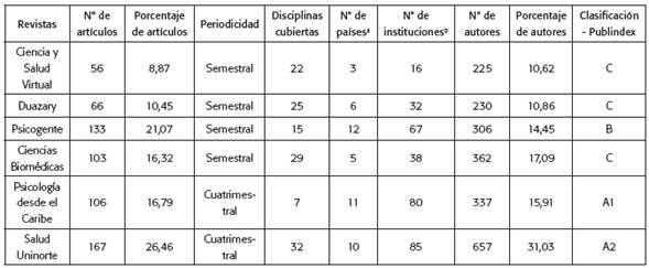 En Colombia, Colciencias por medio del Sistema de Indexación y Homologación de Revistas Especializadas de CTI - Publindex se ha encargado de establecer criterios de calidad editorial de las publicaciones, con el fin de regular los procesos editoriales en las revistas científicas. Actualmente allí se agrupan aproximadamente 100 revistas del área de la salud (Publindex - Colciencias, 2014) en las distintas categorías establecidas por dicho ente. Por su parte, en la región Caribe colombiana se hallan adscritas a instituciones de educación superior seis revistas especializadas en la publicación de temas de la salud, las cuales se mencionan a continuación. Revista Duazary, que ve sus inicios en el primer semestre de 2004 en la Universidad del Magdalena (Ceballos y Pérez-Anaya, 2017), publicando desde entonces temas relacionados con el área de la salud de incidencia en Latinoamérica y el Caribe y presentando una periodicidad de tipo semestral; otra es la revista Ciencia y Salud Virtual, creada en 2009 en la Corporación Universitaria Rafael Núñez de Cartagena, publicando semestralmente resultados de investigaciones en este mismo tema; de igual forma, y en esa misma ciudad, en 2010 surge la revista Ciencias Biomédicas por iniciativa del Departamento de Investigaciones de la Facultad de Medicina de la Universidad de Cartagena, en donde se establece una periodicidad semestral para la revista y además se opta por la publicación de manuscritos del área de la salud. Una más antigua y dedicada a publicar artículos de la Psicología es la revista Psicogente, creada en 1998 en la Universidad Simón Bolívar de Barran-quilla y desde entonces la presentación de su producción científica se da bianualmente; por su parte, la Universidad del Norte con la revista Salud Uninorte marca un hito en la región Caribe al poseer la publicación de carácter científico más antigua, con más de 30 años de existencia y que actualmente se posiciona como una de las revistas más importante en el área de la salud del país; por último, y otra de no menor importancia y creada en la anterior universidad, es la revista Psicología desde el Caribe, fundada en 1998 y que a partir de 2012 cambia su periodicidad a cuatrimestral, con el fin de mejorar su dinámica de comunicación científica en lo que respecta a temas de psicología clínica, psicología de la salud, neuropsicología, entre otras áreas afines.