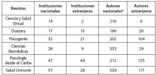 Para el caso de las instituciones nacionales se encontró que la revista Salud Uninorte es la que más pluralidad presenta, pues recibe contribuciones de 57 de estas, integradas por universidades, institutos, centros hospitalarios, etc.; le sigue Psicología desde el Caribe con 47 y Psicogente con 32. Por el lado de las instituciones de origen extranjero, se que Psicología desde el Caribe encabeza la lista con 44, seguida por Salud Uninorte (28), Psicogente (21) y la Duazary con 15, a la cual se le resalta el hecho de recibir casi en la misma proporción contribuciones de origen nacional como del extranjero; caso contrario al que sucede con las revistas Ciencias y Salud Virtual y Ciencias Biomédicas, en las que se observa una moderada disparidad entre el número de instituciones nacionales y extranjeras. Para los autores nacionales también se visualiza en primer lugar Salud Uninorte (539), en segundo lugar Ciencias Biomédicas con 333, Psicología desde el Caribe con 212 y Ciencia y Salud Virtual con 219. Para los autores con afiliación extranjera se resalta nuevamente a Psicología desde el Caribe con 125, seguida de Salud Uninorte con 117 y Psicogente con 104 (tabla 2).