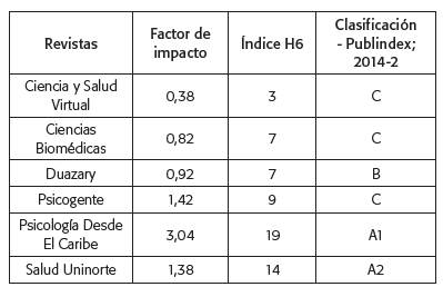 En lo que corresponde a los indicadores citacionales, se encontró que la revista Psicología Desde el Caribe presentó los valores más altos en el factor de impacto (3,04) e índice H6 (19), lo cual coincide con su categoría en Publindex, que es la mayor; en segundo lugar se ubica Salud Uninorte, seguida de Psicogente, Duazary, Ciencias Biomedicas y Ciencias y Salud Virtual, respectivamente.