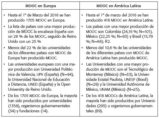 En sus comienzos, la idea de ofertar cursos pensados en la masividad se volvía un escenario tentador para lograr llegar a grandes poblaciones de estudiantes. Es así, entonces, como la iniciativa fue denominada como una revolución educativa y catalogada como una disrupción tecnológica (Armstrong, 2012). América Latina no fue ajena a esta tendencia y la producción de MOOC ha sido adoptada con más fuerza en unos países más que en otros. Los datos registrados para 2016 ubican a México, Colombia y Brasil como los mayores productores de cursos con 157, 110 y 87, respectivamente. Luego se ubican Perú (46), Costa Rica (35), Venezuela (31) y Chile (29) (Pérez, Maldonado y Morales, 2016).