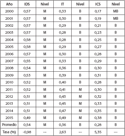 En cuanto al índice del desarrollo sustentable, en el 2000 tenía un valor de 0,60. A partir del 2008-2015 ha continuado su disminución (hasta 0,49 en el 2015), de modo que ha mantenido un nivel medio, pero con tendencia a la baja. Los índices se comportan de manera inversa: IT va al alza, e IDS va a la baja. En cuanto a lo que respecta a los conflictos sociales, estos iniciaron en el 2000 con un nivel bajo (0,17), hasta alcanzar un nivel medio (0,38) en el 2015, con una tendencia al alza. Durante el periodo analizado se observa que la mayor tasa de crecimiento corresponde al ICS (5,35%), poco más del doble de la tasa del IT (2,63%). La menor tasa (-0,98%) correspondió al IDS, lo que indica que el turismo y los conflictos van al alza, en tanto el desarrollo va a la baja (cuadro 4).