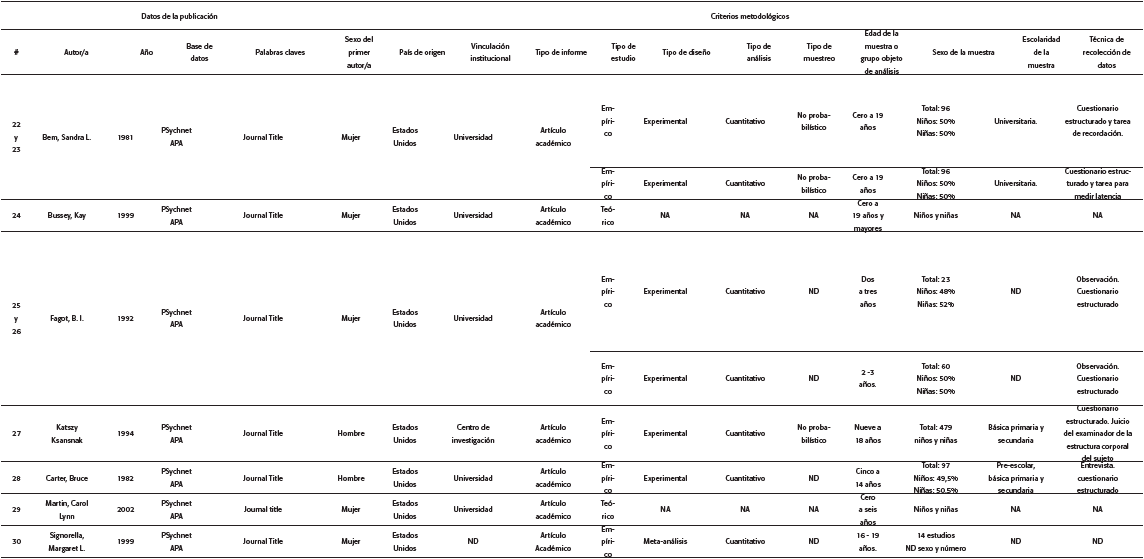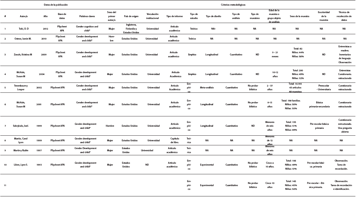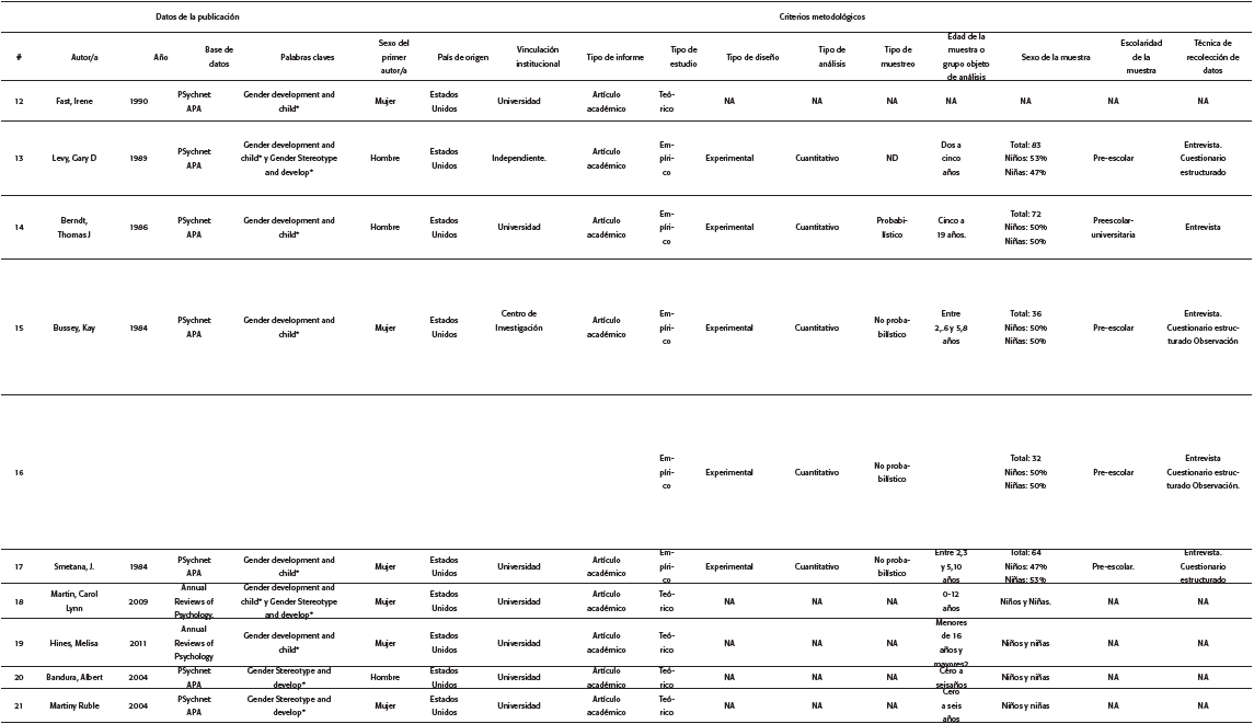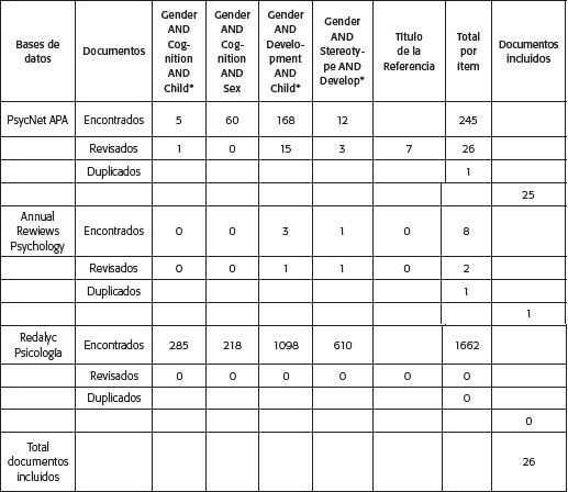 El mayor número de documentos (25) se encontró en la base de datos PsycNET APA, seguido por un documento en Annual Rewiews Psychology. A pesar de incluir criterios de búsqueda tanto en inglés como en español, no se encontró ningún estudio que cumpliera los criterios de elegibilidad en la base de datos en español Redalyc Psicología. El criterio de búsqueda que arrojó el mayor número de estudios (16) fue "«Gender AND Development AND Child>>". En la Tabla 1 se encuentra el número de documentos revisados por estrategia de búsqueda, base de datos y criterio de búsqueda.