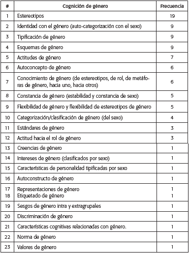 Los hallazgos revelaron un total de 23 CG diferentes mencionadas en los estudios revisados. Los resultados muestran que la CG a las que se hace mención corresponden, con mayor frecuencia, a los estereotipos de género (19)2. En algunos casos (5) más que una cognición se estudia un atributo de la cognición, como en el caso de la flexibilidad de género o la flexibilidad de estereotipos de género. En la Tabla 3 se puede observar la lista de las CG mencionadas en los estudios revisados.
