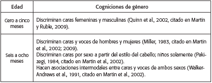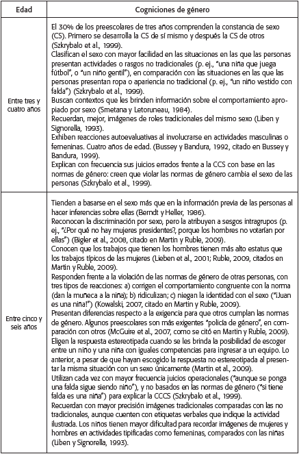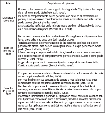 Finalmente, con relación a las trayectorias o hitos que caracterizan el curso del desarrollo de las CG desde el nacimiento hasta los 19 años de edad (los cuales se sintetizan en la Tabla 4) permiten concluir que, si bien existe evidencia de algunos hitos en el desarrollo de las CG y abundante información sobre cogniciones específicas en momentos y grupos particulares, el interés que ha guiado los estudios acerca del desarrollo de las CG se enfoca más en el origen y la variación de algunas pocas CG, y menos en estudiar la continuidad de los cambios (Larreamendy, Puche Navarro y Restrepo Ibiza, 2008) de las CG a lo largo de la infancia. Aunque se dispone de evidencia acerca de la identificación de diversas trayectorias en el desarrollo de las actitudes sexistas (Crouter, Whiteman, McHale y Osgood, 2007), las cuales se ha encontrado que varían en función de características personales (p. ej., el sexo y el lugar de nacimiento) y contextuales (p. ej., las actitudes de género de los padres y el sexo de los hermanos), los hallazgos del presente estudio proveen escasa información sobre dichas trayectorias en otras CG.