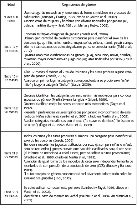 ABSTRACT: Despite the growing interest in the promotion of cognitions related to equity in children and young people, little is known about the development of gender cognitions ( CG) throughout childhood. With the aim of contributing to identify, integrate and facilitate the use of the available evidence on the subject, a qualitative systematic review was carried out in three electronic databases with extensive experience in psychology. A total of 30 reports were coded and analyzed using the coding manual of Vargas Trujillo (2004). Based on the findings, a timeline for the development of CG from zero to 19 years is proposed in order to facilitate its use by those interested in the design of interventions aimed at promoting cognitions related to equity in childhood based on evidence.