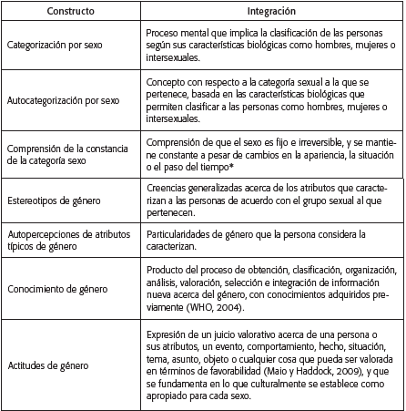 De otra parte, se encontró que los constructos de sexo y género se utilizan en la mayor parte de los estudios de manera intercambiable; excepcionalmente se definen separadamente (Berndt y Heller, 1986; Levy y Carter, 1989). En algunos estudios, se habla de género para referirse a aspectos tan diversos como, por ejemplo, las diferencias sexuales anatómicas o funcionales (Bussey y Bandura, 1984; Katz y Ksnasnak, 1994; 1999; Ovstrov y Doldeski, 2010; Smatana y Letoruneau, 1984; Zosuls et al., 2009), los roles (McHale et al., 2004), y las competencias o la orientación sexual (Hines, 2011).