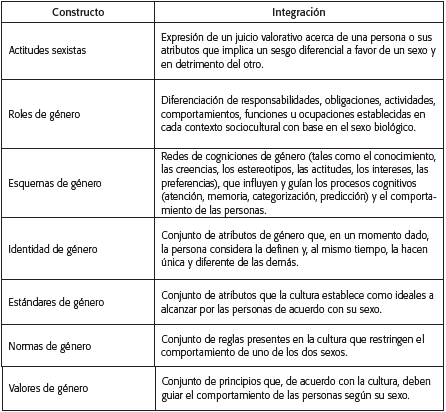 A fin de contribuir a dar coherencia y estructura a este campo del conocimiento, con base en la organización y el análisis de los resultados de esta revisión sistemática, y con la intención de facilitar la utilización de la información disponible, la autora propone en la Tabla 5 una conceptualización integradora de cada uno de los constructos que se definieron de forma explícita en los estudios5. Contar con dicha integración facilita a quien esté interesado en promover cogniciones afines a la equidad de género identificar el objeto y alcance de su intervención.