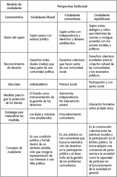 En este sentido, se toman tres perspectivas para comprender el ejercicio ciudadano con la relación de la vida en sociedad: la liberal, la comunitarista y la republicana (Gimeno, 2001, citado en Castillo García, 2006).