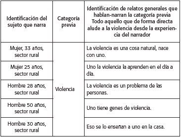 Cuando se han recabado las narrativas de los actores motivadas por las preguntas según las categorías iniciales, pasamos a una primera lectura y desestructuración de estas mediante la identificación de relatos (unidad semántica de interpretación) que aluden a los interrogantes o a las categorías iniciales, de modo que más que respuestas son ofertas y ejercicios propios de memoria. Para este fin se usaron instrumentos tales como matrices o mapas de relatos. El proceso de reconstrucción que se propone sugiere elaborar matrices y mapas para cada categoría.