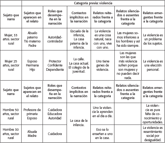 Despues de la primera lectura de las narrativas recabadas, se contó con un corpus de relatos que nombran la categoría previa que orienta la investigación. Así, entonces, la investigadora volvió sobre los relatos seleccionados en la tabla 1, y empieza una segunda lectura.