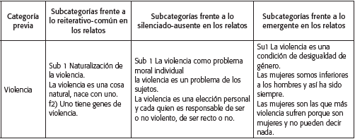 Posteriormente, se avanzó en el proceso interpretativo mediante la organización de los relatos en un conjunto de hipótesis interpretativas que ayudan a ampliar las preguntas y las categorías iniciales. El conjunto de preposiciones se expresa en subcategorías y tendencias emergentes. Esta forma de categorización permite ampliar la comprensión de la categoría previa según los elementos que han narrado los actores.