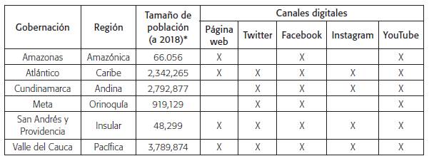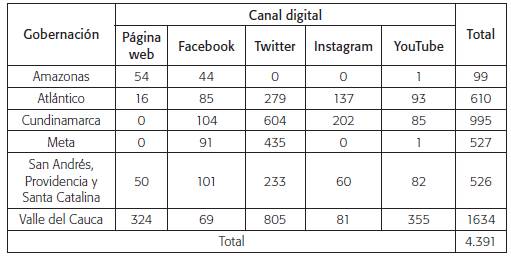 En la siguiente tabla se recopilan los datos de las gobernaciones y canales digitales de la muestra.