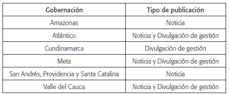 Si bien cada gobernación presenta un comportamiento diferenciado (como se detalla en la Tabla 3), destaca el uso mayoritario del tipo de publicación Noticia, sobre todo, en Página web, Face-book y Twitter; evidencia de que persiste un enfoque informativo, utilizado para divulgar situaciones, medidas, logros o cambios que afectan al departamento o a alguno de sus territorios.