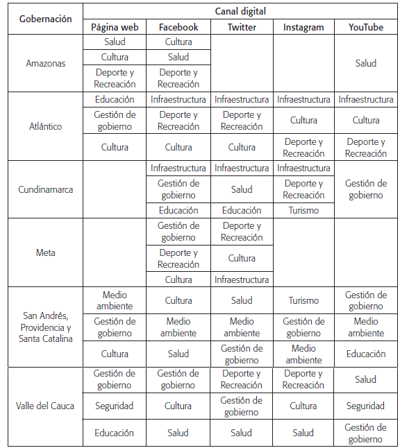 Mientras las gobernaciones de Amazonas y Atlántico se enfocan en informar y divulgar desde una perspectiva periodística los contenidos relacionados con el departamento, la gobernación y las instituciones adscritas, Valle del Cauca y Cundinamarca realizan un mayor despliegue comunicativo que apunta a posicionar al gobernante y la gobernación. Es decir, que buscan evidenciar continuamente, y en varios canales a la vez, la gestión gubernamental, su presencia y actuación en diversos lugares y frente a varios temas, dejando de lado el carácter informativo para establecer una conexión permanente con la ciudadanía e infundir confianza y transparencia.
