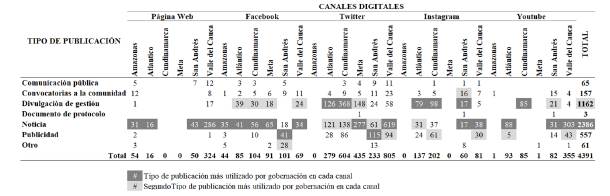 La tabla que se presenta a continuación permite contrastar los tipos de publicación entre las gobernaciones e identificar el total de publicaciones de comunicación pública en cada una de ellas.