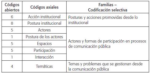 A partir del análisis de los códigos abiertos se llevó a cabo la codificación axial, en donde las asociaciones entre estos dio paso a 8 códigos axiales que dejan ver las perspectivas desde las que se aborda la comunicación pública, pues están claramente diferenciadas aquellas que expresan una postura institucional, las que documentan acciones, las que dejan ver cómo hay un reconocimiento y presencia de diversos actores, las que refieren espacios para el diálogo y la toma de decisiones, las que evidencian formas de participación y las que dejan ver la especificidad sobre los temas que se abordan.