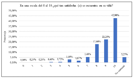 Esta dimensión se midió en escala Likert del 0 al 10, encontrando que la mayoría de los beneficiarios de los CIS se encuentra muy satisfecha con su vida debido a que 42.96 % seleccionó el valor 10, en segundo lugar, el valor 9 (22.20 %) y, en tercer lugar, el valor 8 (17.66 %) (Ver Figura 1). Si desglosamos estos resultados acorde al sexo, encontramos que las mujeres tienen una satisfacción vital mayor que los hombres, ya que el promedio obtenido en una escala del 0 al 10 fue de 8.86 para las mujeres y 8.48 para los hombres. Este resultado dista del último reporte a nivel nacional en el que la satisfacción vital de los hombres es mayor que el de las mujeres con un promedio de 8.4 y 8.3, respectivamente (INEGI, 2018).