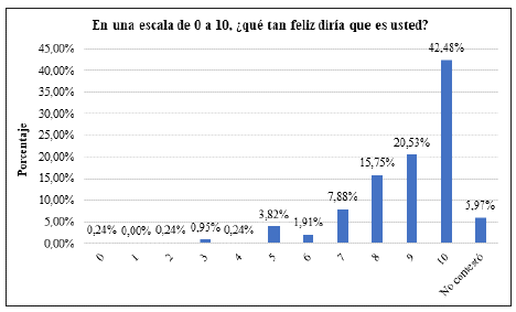 El promedio general de la felicidad, de acuerdo con la percepción de los encuestados, es de 8.71. La media nacional en la última medición del Índice Mundial de la Felicidad (UN, 2018) fue de 6.48 (Ver Figura 2).