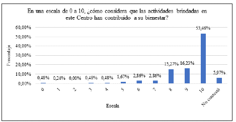 Resulta relevante el hecho de que la mayoría de los encuestados (93.32 %) recomendaría a amistades o familiares acudir a los centros, puesto que perciben un beneficio al participar en ellos. Las principales razones son: a) el buen servicio, b) la variedad de actividades que ofrecen, y c) la convivencia.
