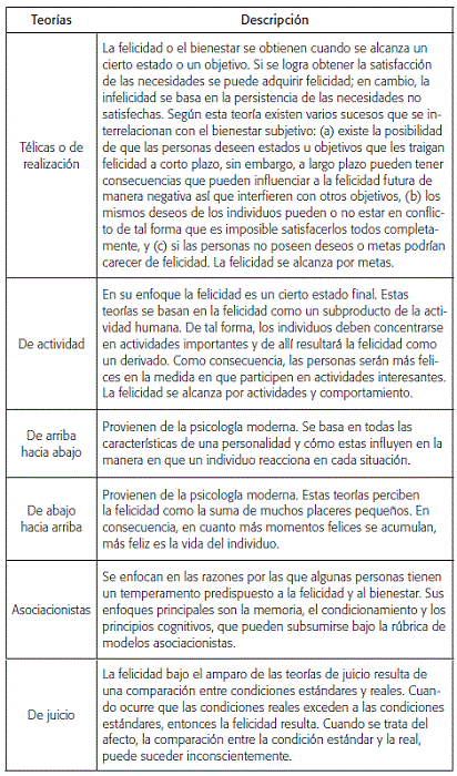 De acuerdo con Diener (2009), existen seis teorías acerca del bienestar subjetivo (Ver Tabla 1).