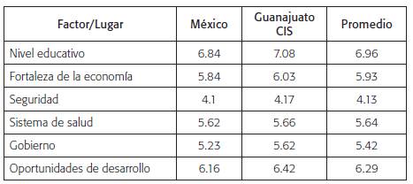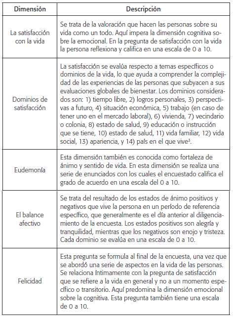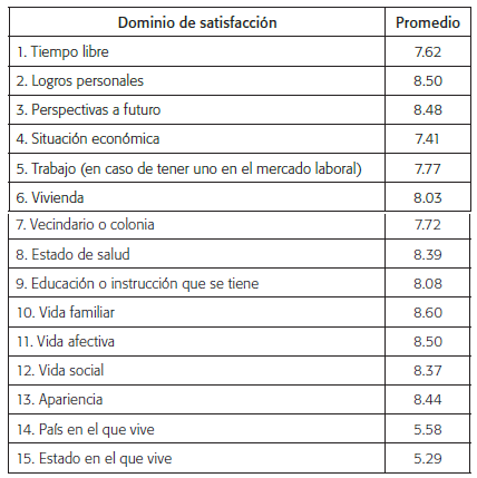 Dentro de esta dimensión se midieron los dominios donde los encuestados perciben mayor satisfacción. En los resultados predominan: 1) la vida familiar, 2) la vida afectiva, 3) los logros personales, y 4) las perspectivas a futuro. El promedio general en una escala del 0 al 10 de los quince dominios fue de 7.78. Los dominios de satisfacción mejor punteados son los que corresponden a la vida privada de los encuestados (los enunciados), y los menores punteados los de la esfera pública (situación del estado y el país en el que vive) (Ver Tabla 4).