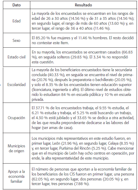 La investigación es de tipo cuantitativo y se utilizó como herramienta la encuesta, además de la revisión documental. Tuvo un alcance descriptivo y comprensivo. La muestra fue incidental y estuvo compuesta por 419 beneficiarios distribuidos en 54 Centros ubicados en 32 de 46 municipios del estado de Guanajuato.