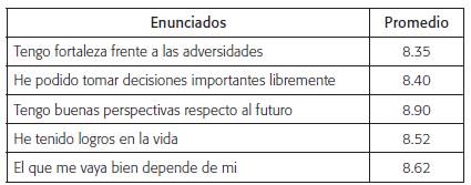 Como es posible apreciar en la Tabla 5, la mejor evaluación fue para las perspectivas del futuro, mientras que la más baja fue para las fortalezas frente a las adversidades.