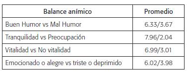 En esta dimensión se pide al encuestado evaluar del 0 al 10 los estados anímicos positivos y negativos que predominaron en su persona el día anterior. Se encontró que los estados anímicos positivos imperaron sobre los negativos, siendo los que predominaron: la tranquilidad, el buen humor y la vitalidad (Ver Tabla 6).