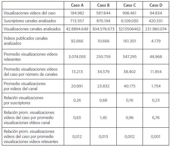 Para establecer el nivel de difusión y viralidad se tuvo en consideración el número de visualizaciones del conjunto de videos, el número de suscriptores de los canales en los que fueron publicados, las visualizaciones totales de estos canales y el número de videos publicados en ellos. Con estos indicadores se establecieron los promedios de: visualizaciones de los vídeos más relevantes de los canales, visualizaciones de los videos del caso por número de canales, y visualizaciones por videos del canal. A partir de estos se establecieron las relaciones que muestra la Tabla 1.
