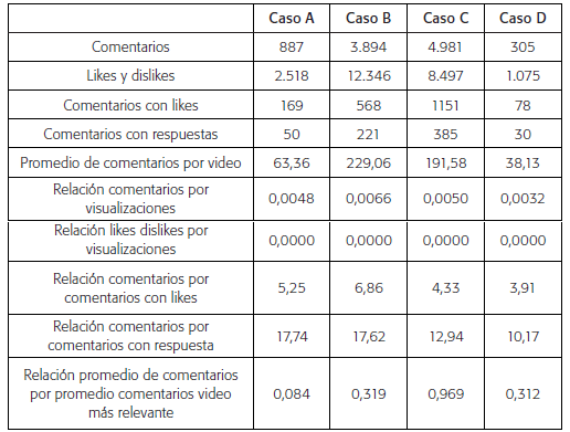 Relacionando el número de suscriptores con las visualizaciones, los resultados muestran que en tres de los cuatro casos hubo un bajo grado de visualización para el alcance del canal. Solo en el Caso B se observa una alta relación (0,68). Se entiende que no todas las personas que visualizaron los videos están suscritas al canal, sin embargo, este indicador permite determinar el alcance del video en el contexto de su potencial de difusión más inmediato.