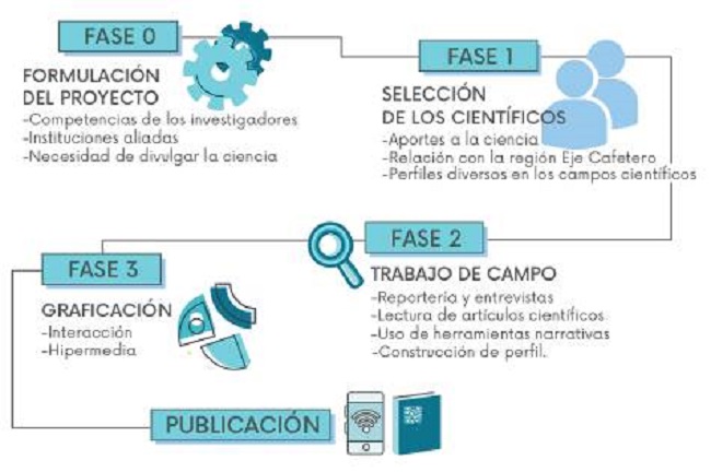 Tal y como se presenta en la figura anterior, este proyecto desarrolló una metodología basada en cinco fases. La primera, fase 0, hace referencia a toda la construcción y consolidación del proyecto, que para este caso inició en 2017 como idea independiente y un año después se incluyó como proyecto de investigación-creación en la primera convocatoria de este tipo en la Universidad de Manizales. Además, se definió la institución (Fundación Academia de Dibujo Profesional) y los investigadores que harían parte del proceso. En este punto fue esencial identificar la falencia que existe en contar historias de científicos regionales y el poco uso del género periodístico del perfil como herramienta narrativa.