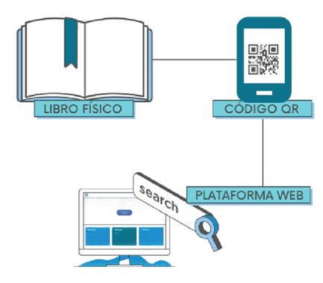 En la gráfica que se encuentra a continuación se observa la relación entre el libro físico y la plataforma web que aloja los contenidos gráficos y cómo, a través de códigos QR, se expande la historia que está escrita con elementos hipermediales: