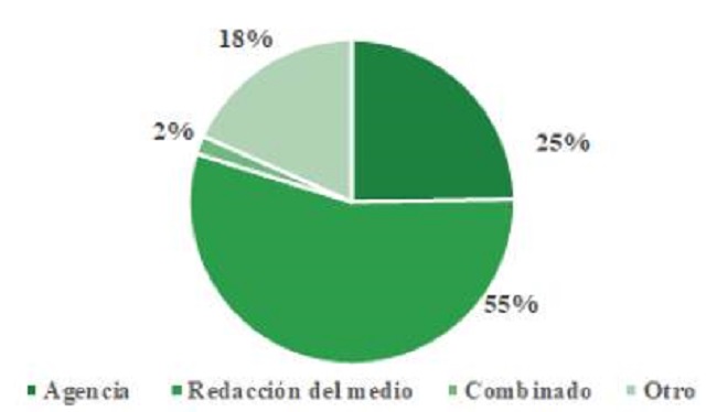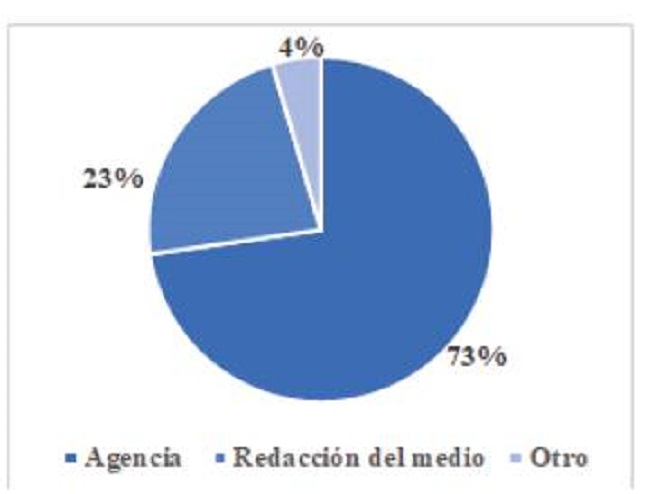 Por otra parte, las publicaciones de agencias corresponden al 25 % de su totalidad. El periódico El Tiempo presenta una característica de análisis fundamental dada en la existencia de un 18 % de noticias, que corresponde a 20 publicaciones de "otras" procedencias. Entre estas se pueden encontrar columnistas invitados, relacionados con el campo de estudio materia del producto periodístico (docentes universitarios, especialistas en temas de salud, expolíticos, periodistas especializados). Se observan también publicaciones de la Agencia Bloomberg, que, para efectos de este estudio, ha sido clasificada como "otras" porque no es una agencia periodística sino un servicio web informativo que ofrece recursos, como noticias y análisis, sobre los movimientos económicos más relevantes en el escenario internacional.