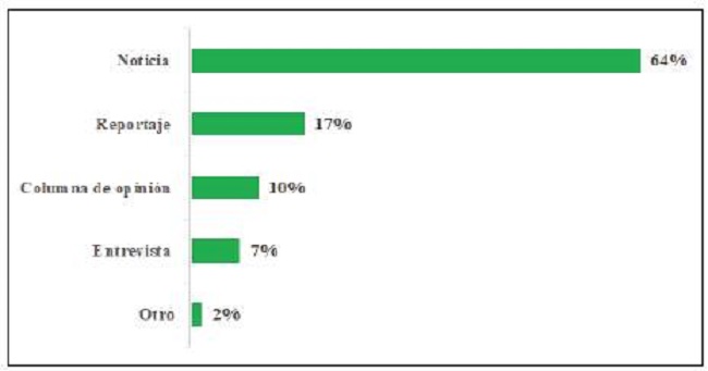 Los géneros periodísticos para este análisis fueron definidos así: la columna de opinión corresponde a la exposición del punto de vista del autor para argumentar un tema planteado. El reportaje gráfico se entiende como la captura de momentos representados en un conjunto de fotografías. En cuanto a la noticia, es un relato objetivo en el cual el periodista se ciñe estrictamente a los hechos ocurridos. El reportaje se comprende como un producto periodístico que combina la descripción de los hechos noticiosos junto a la narración propia del periodista con el fin de exponer un contexto amplio sobre el suceso. La crónica se entiende como un relato que narra de manera secuencial un hecho enriquecido a través de la combinación de historias y personajes a su alrededor. Finalmente, se definieron dos géneros periodísticos adicionales: la entrevista, como un diálogo entre el periodista y la fuente seleccionada acerca de un tema específico. Por último, el informe especial, como un trabajo periodístico de alto nivel en su calidad investigativa, generalmente se caracteriza por intentar evidenciar todas las perspectivas posibles frente a un hecho noticioso.